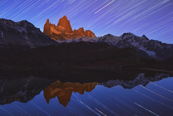 When the camera completed the last exposure, I browsed through the shots in a backward order. In the last few shots, I noticed the Fitz Roy peaks glowing brightly in the dark. I lifted my head up to the sky and saw the peaks still translucent in the night.  At the same time, the moon was rising behind me – this was an amazing natural phenomenon caused by moonlight.