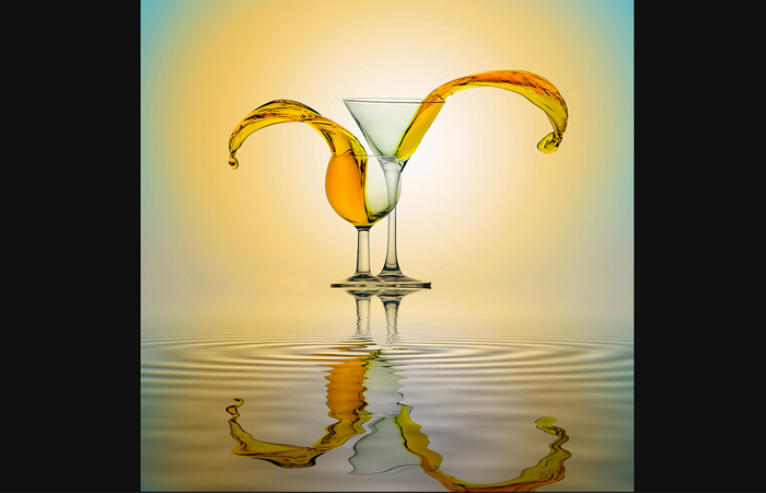 I was inspired by a video tutorial on the internet describing how to create water splashes in a glass. After understanding the basic procedure, I came up with an idea to make something different. I decided to not only freeze the splash in action, but to also tell an abstract story, as if the glasses were living things.